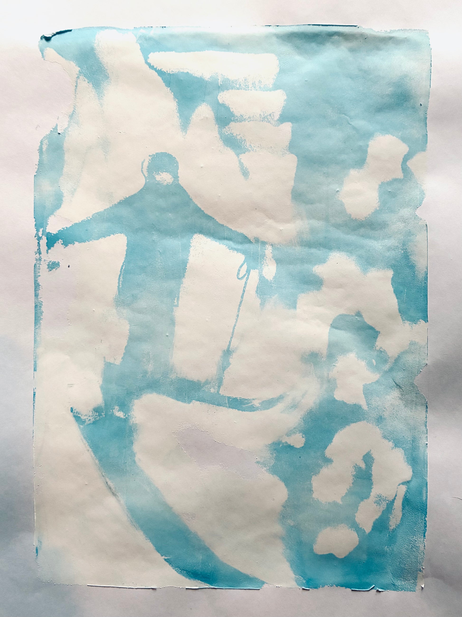 Kein Gipfel. Nur Skifahrer. Nur Himmel, Luft, Stille. Dieser Monoprint destilliert das Wesen des Winters in seine reinste Form — Türkis auf Weiß, wie Atem auf Glas.
