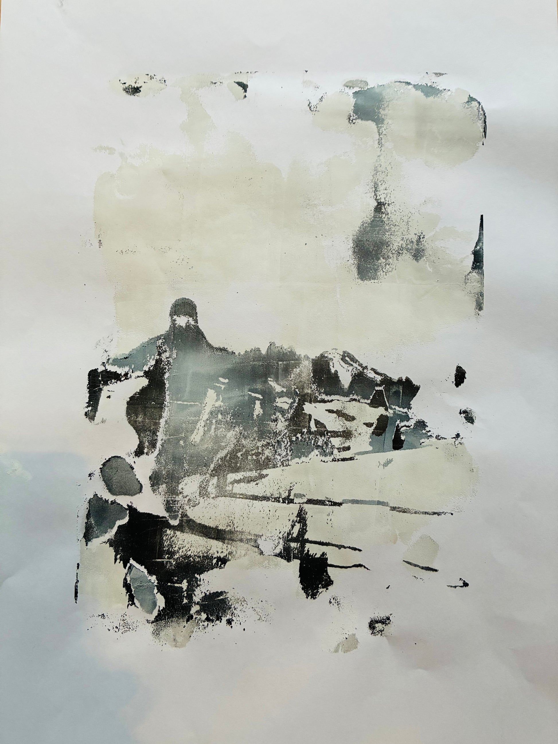 Eine Gestalt, ein Berg, unendlich viel Grau. Dieser Print fühlt sich an wie eine Erinnerung — halb da, halb schon verblasst.