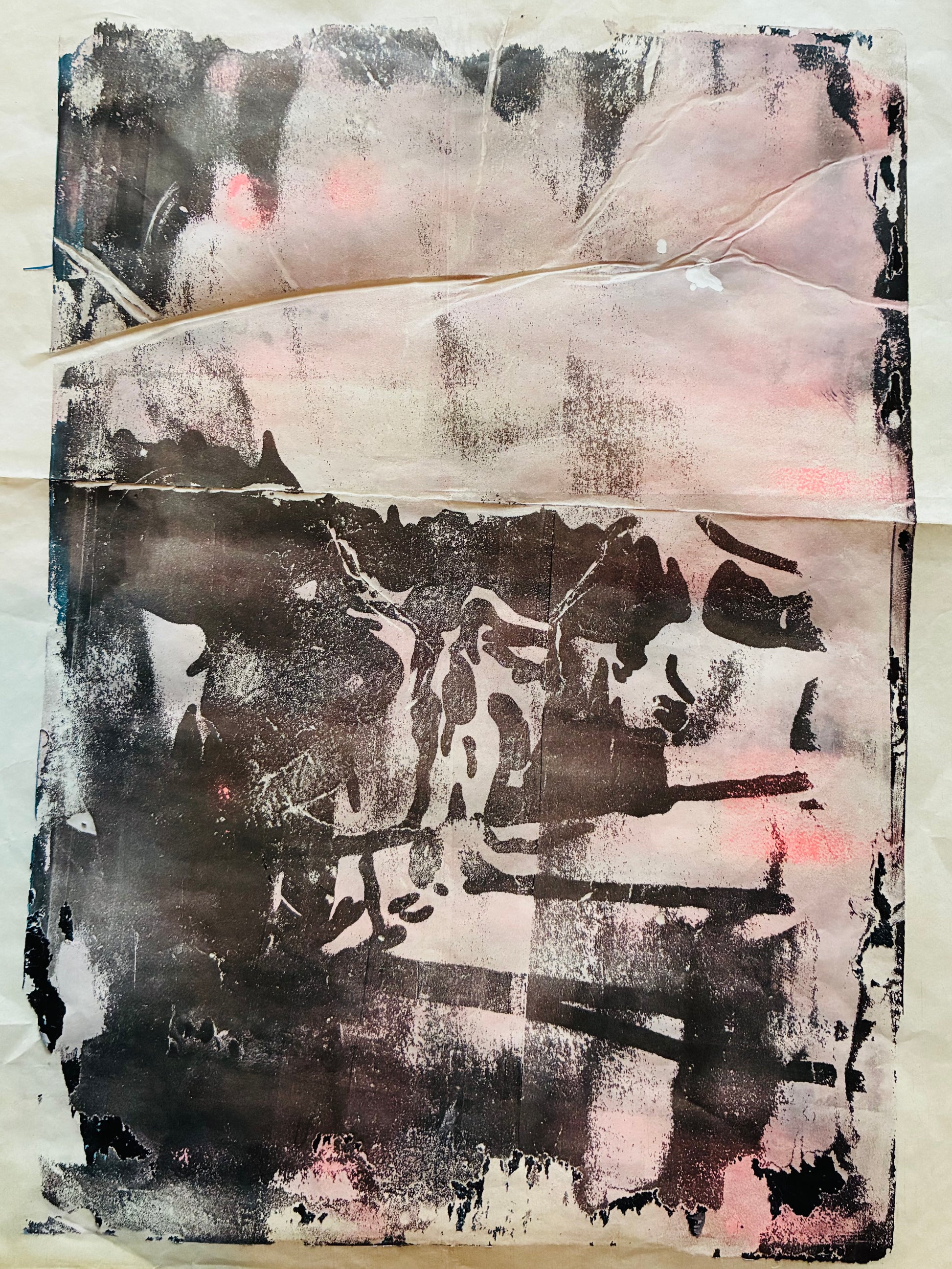 Das Papier ist Teil des Werks — gefaltet, zerrissen, lebendig. Dieser Monoprint auf Reispapier zeigt Winter nicht als Idylle, sondern als Kraft. Das dominante Schwarz bricht sich an weissen Flächen, Pinktöne leuchten wie Warnlichte. Die Struktur des Reispapiers gibt dem Druck eine textile Qualität — fast wie ein Tuch, das den Wind hält. Ein Sammlerstück für mutige Wände. Handgedruckt, Unikat, nicht zu wiederholen.